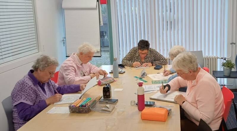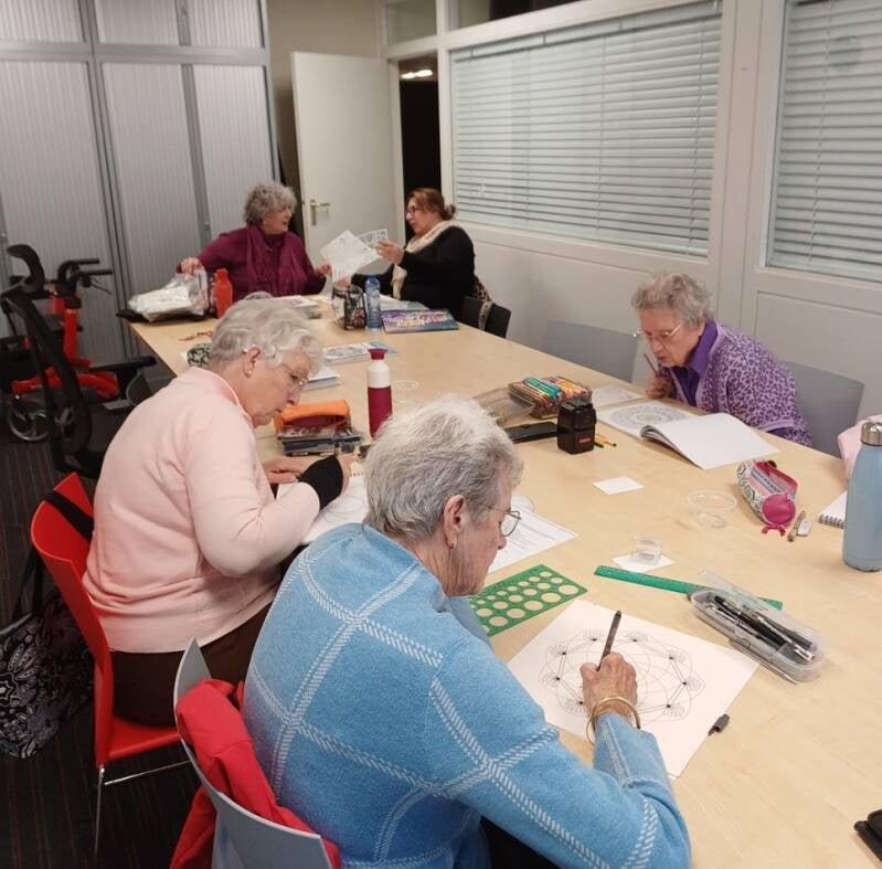 Wij zijn een gezellige mandala tekenclub en bestaan uit 2 groepen die elk 12 keer per jaar samenkomen in de creazaal van wijkcentrum De Brug in Schiedam.