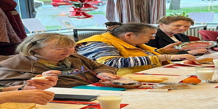 Onze vrijwilligers vulden de sierlijk gedekte tafels aan met bladerenslingers, en met een door Christien gemaakt sneeuwvlok kunstwerkje met kerstwens voor aan de glazen (later te gebruiken op een mandala).