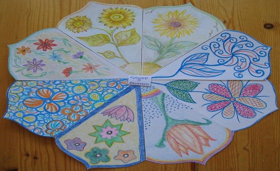 Iedere groep begon met een taartpunt voor een groepsmandala, met eigen ontwerp: groep 1 vlinders/ insecten, groep 2 de zee, groep 3 bloemen/vogels.